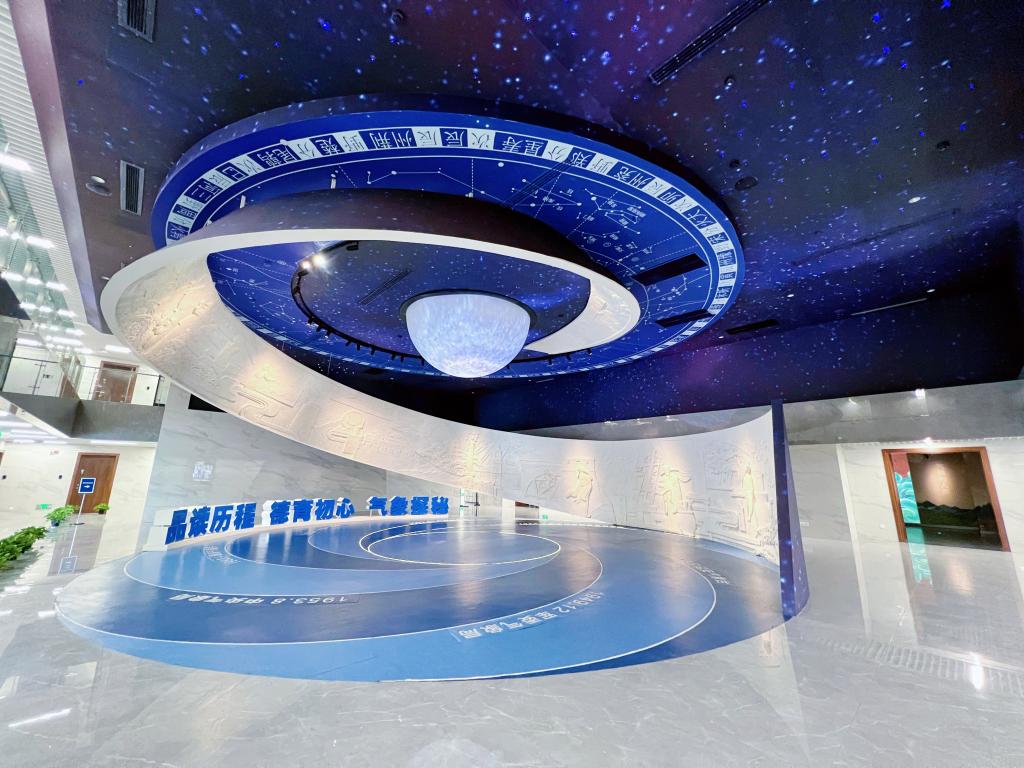 紹興氣象博物館的序廳,中間是主題造型建筑,以飛舞向上的螺旋造型浮雕和頂部星空天花造型為基礎(chǔ),螺旋向上的浮雕體現(xiàn)氣象從古到今的現(xiàn)代化發(fā)展歷程,頂部天花為中國二十八星宿天文圖,展示氣象與天文之間的密切關(guān)系,眾所周知的二十四節(jié)氣就是由我國古人在觀察地球繞日公轉(zhuǎn),日影長度的變化而歸納總結(jié)出。