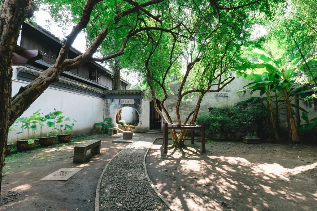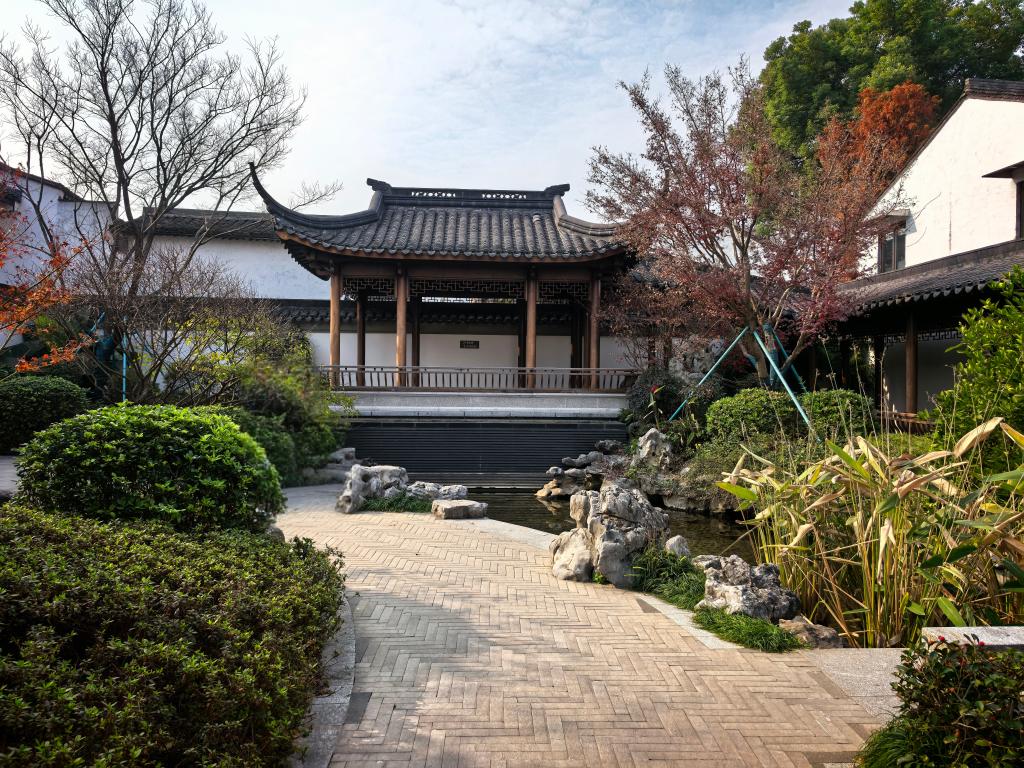 紹興師爺館后院的中式園林景觀,飛檐翹角的亭子、白墻黛瓦的建筑,搭配假山、綠植、水池,營造出寧靜雅致的氛圍,讓人感受中式古典韻味與閑適意境