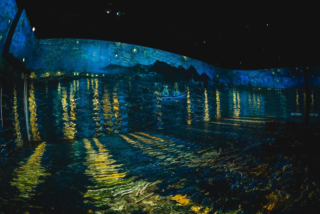 藝術(shù)館的沉浸式數(shù)字廳,將徐渭和梵高共置一室。東方的“大寫意”遇上西方“印象派”,兩位生前寂寞死后榮耀的天才藝術(shù)家在此相遇,無論是“中國的梵高”還是“西方的徐渭”,這不約而同的“命運(yùn)多舛”經(jīng)歷詮釋了天才畫家的誕生,讓觀眾沉浸于徐渭狂放的山水和梵高靜謐的星空中